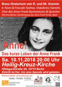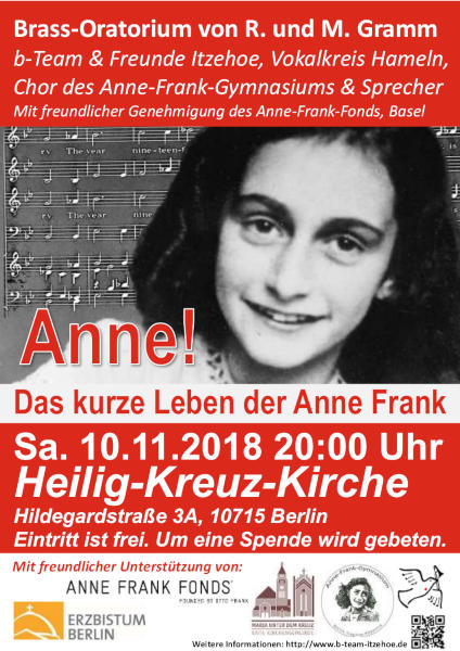Die Uraufführung war auf dem evangelischen Kirchentag 2015 in Stuttgart. Seitdem haben wir das Brassoratorium „Anne! – das kurze Leben der Anne Frank“ von Reinhard und Marita Gramm dreiundzwanzigmal gezeigt, darunter auch auf dem evangelischen Kirchentag 2017 in Berlin.